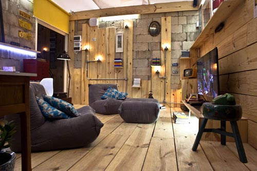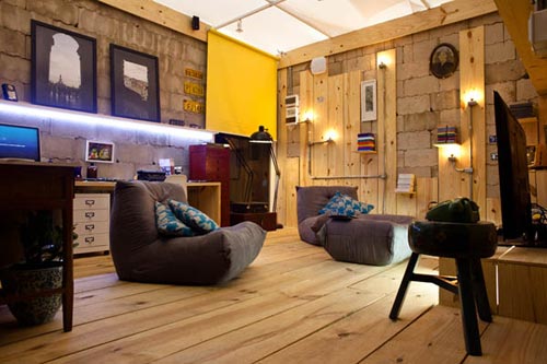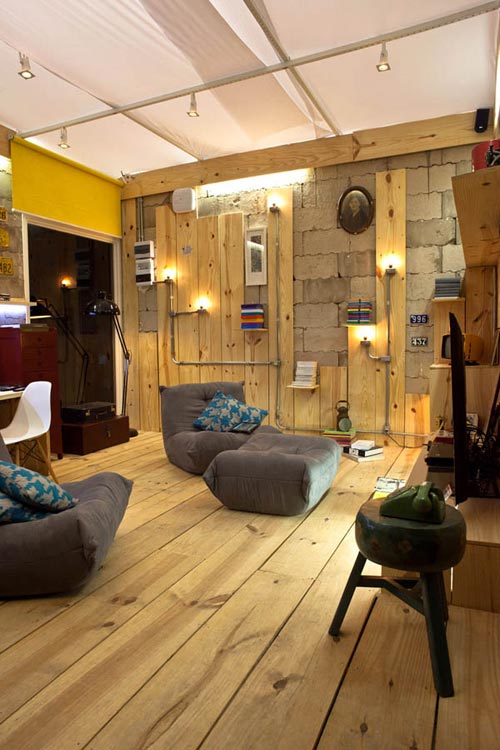 Deze bijzonder woonkamer is gelegen in een huis in Ribeirao Preto, Brazilië. Het interieur ontwerp behoort tot de creatieve geesten van de Braziliaanse architecten YTA. Ze zijn vooral erg creatief geweest met het gebruik van hout, door deze op een bijzondere manier te verwerken in zowel de vloer als de wanden. Ook de verlichting in deze woonkamer zou je kunnen omschrijven als speels en creatief.